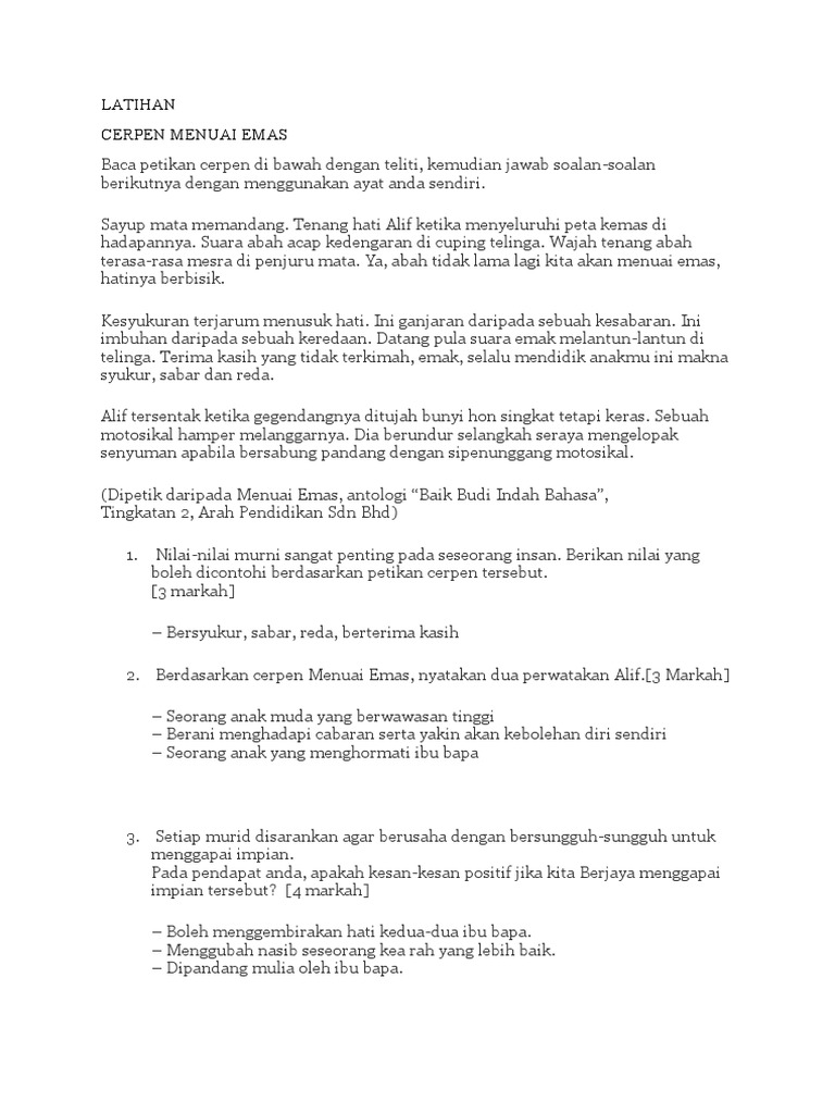 Alif terkenang akan perbualan dia dengan ayahnya suatu ketika dahulu. Berikutnya sinopsis tema persoalan plot watak perwatakan latar gaya bahasa. Sinopsis cerpen menuai emas tingkatan 2.